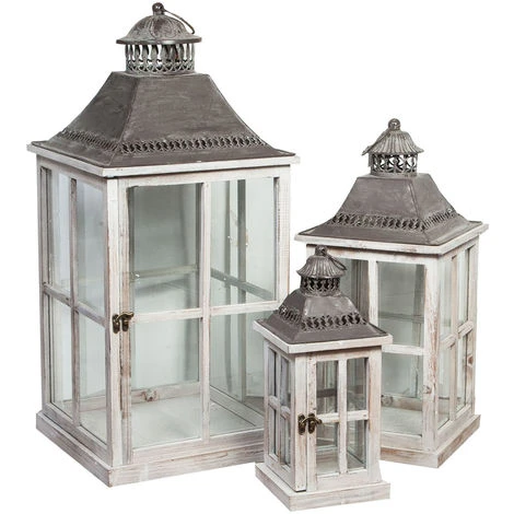 Set 3 lanterne di dimensioni lunghezza 31 cm, profondità 31 cm, altezza 68 cm (grande), lunghezza 23 cm, profondità 31 cm, altezza 49 cm (media), lunghezza 15 cm, profondità 15 cm, altezza 36 cm (piccola) realizzate in legno e ferro. Oltre che come portacandela, si propone come elegante complemento di arredo con un tocco di stile Shabby.