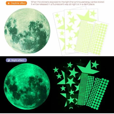 - Glow Musk Night Luminous Phosphorescent Wall Decal – Riceverai 1 grande luna luminosa (30 cm), 407 punti che vanno da 0,5 cm a 1,5 cm, 27 stelle che vanno da 3,6 cm a 14,8 cm. Tutti i 435 pezzi in un unico pacchetto. Crea il tuo cielo stellato. Starscape o modelli da godere come regalo per adulti o bambini.