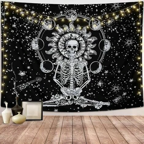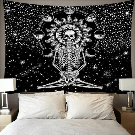 Questo arazzo con teschio di scheletro da meditazione è facile da appendere con spille decorative, puntine da disegno, strisce di controllo o cinturini in velcro.