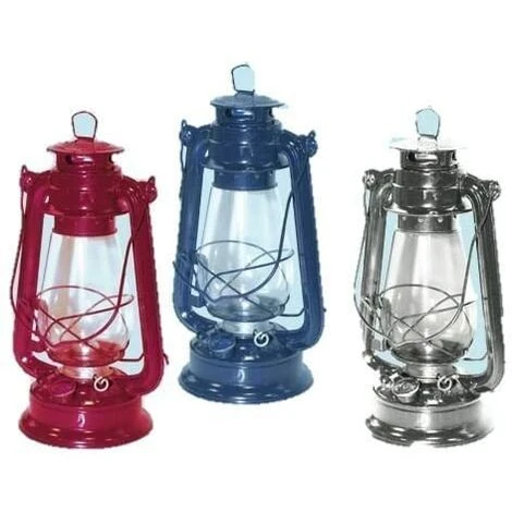 Lanterne a petrolio In acciaio colorato, portata cmc 320, durata circa 30 ore. Altezza 30 cm.