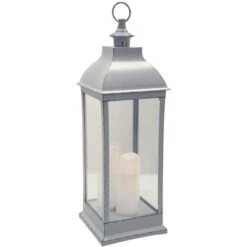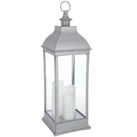 Lanterna LED grigio antico, vetro e ABS, dimensioni L. 24 x L. 24 x H. 71 cm Candele LED: P. 7,5 x H. 15 18 22 cm