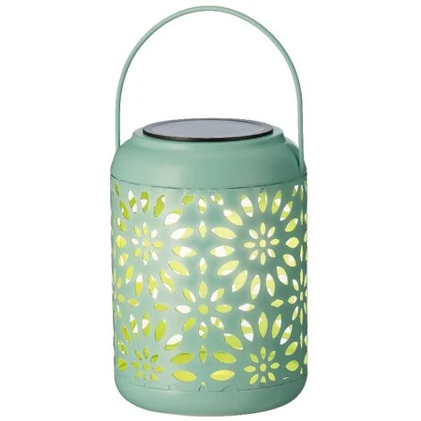 Diametro 12 centimetri x 17 centimetri altezza, in metallo, con luce LED interna ricaricabile con pannello solare posto sulla parte superiore della lanterna, tonalità luce bianco caldo, 7 lumen.