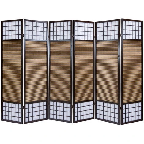 6 pannelli Paravento pieghevole e leggero cerniera bidirizionale. Materiale e colore: Legno inquadramento marrone scuro carta di riso bianca e bambù Dimensioni: Altezza: 175 cm Larghezza: 264 cm Profondità: 2,2 cm Larghezza per pannello 44 cm.