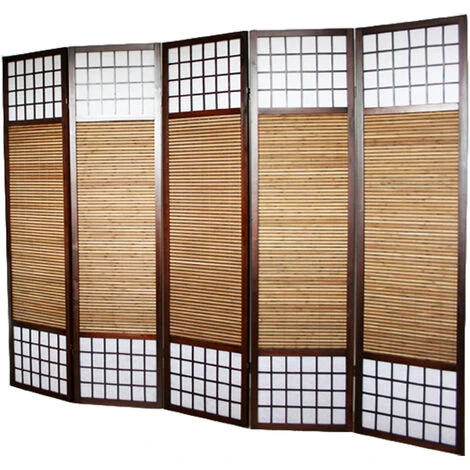 5 pannelli, Paravento pieghevole e leggero, cerniera bidirizionale. Materiale e colore: Legno inquadramento marrone scuro , carta di riso bianca e bambù. Dimensioni: Altezza: 175 cm Larghezza: 220 cm Profondità: 2,2 cm Larghezza per pannelli 44 cm