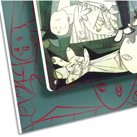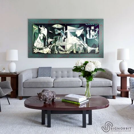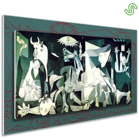Quadro su PVC da 5mm, soggetto: Guernica di Pablo Picasso, montata con viti e coprivi in acciaio. Questo complemento d’arredo è disponibile nella seguente misura: 140×70 cm.