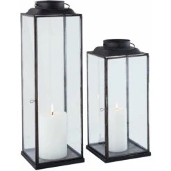 Lanterna In Vetro E Metallo Di Design Moderno Stile Minimalista Portacandela, Cm 14,5×14,5×25 H
