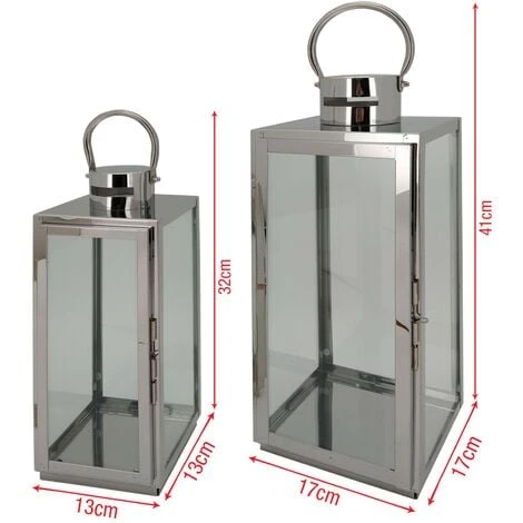 – SPECIFICHE: Dimensioni lanterna grande: H 41 x L 17 x P 17 cm – Dimensioni lanterna piccola: H 32 x L 13 x P 13 cm – N° lanterne: 2 – Colore: Grigio Effetto Argento – Materiale: Acciaio Inox, Pvc – Cod. RE6824