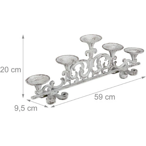 Il raffinato portacandele è in grado di creare in pochissimo tempo un’atmosfera piacevole a casa vostra. Il candelabro è dotato di 5 bracci con supporti per candele e rifinito con peculiari decorazioni in stile barocco. Realizzato interamente in ghisa dal particolare stile shabby chic, questo accessorio non potrà che arredare con eleganza la vostra casa. Nei 5 supporti potrete posizionate lumini o candele piccole.