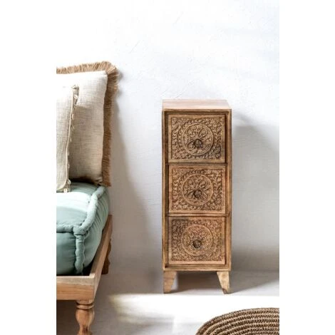 Ottieni ulteriore spazio nella tua camera da letto con il cassetto in legno di mango Utara . È realizzato in legno di mango e i disegni intagliati sulla parte anteriore dei cassetti conferiscono a Utara un aspetto boho-chic che adorerai . Non rinunciare ad avere una casa organizzata e funzionale ma con il proprio stile. Combinalo con un comodino e altri accessori in questo stile e trasforma una stanza semplice in un luogo caldo e accogliente. In SKLUM ci impegniamo per un modello completamente fatto a mano , curando ogni dettaglio e rendendo ogni pezzo unico ed esclusivo. Per una corretta manutenzione si consiglia di pulirlo con un panno umido. Si consiglia di tenerlo lontano da umidità e sostanze chimiche che possono danneggiare il legno. Dimensioni: ∼68 cm x ∼26 cm x ∼21 cm IMPORTANTE: Il servizio standard porta a porta non include la consegna e il ritiro della merce a casa del cliente, che è responsabilità del cliente. È possibile che la persona che effettua la consegna assista volontariamente alla consegna della merce (questo è completamente volontario per la persona che effettua la consegna e la società di trasporto e non è responsabilità di Sklum).Anche il montaggio non è incluso.