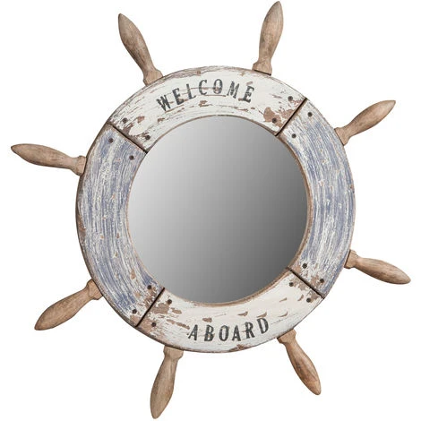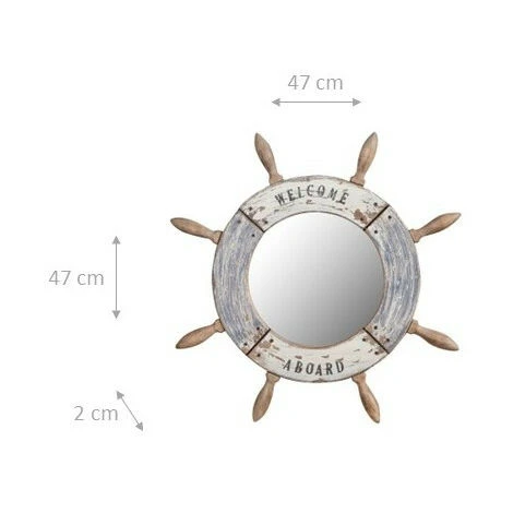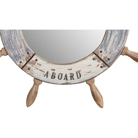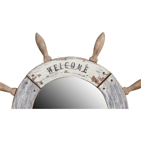 Specchio da parete a forma di timone in legno massello vecchio riciclato dipinto a mano. Misure Diam.L47xPR2 cm. La lavorazione artigianale e la finitura con vernici naturali, rendono ogni oggetto un pezzo unico.