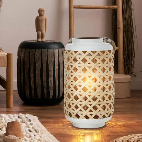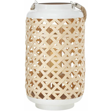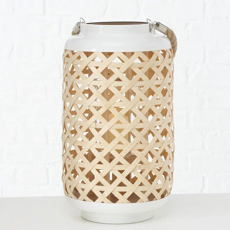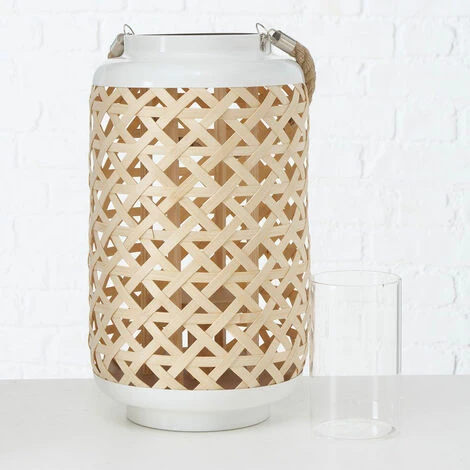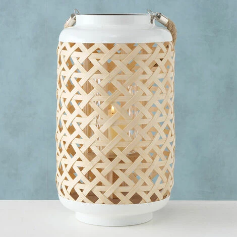 Descrizione Lanterna in stile Boho. Il corpo in ferro bianco è decorato tutt’intorno con una rete di bambù e all’interno si trova un contenitore in vetro per una candela. Goditi la luce della tua candela preferita con questa lanterna. Il telaio può essere integrato al meglio in stili abitativi e di arredamento in cui il legno è pesante. Questo bellissimo portacandele è adatto per uso interno. dettagli • Tipo di prodotto: Lanterna • Materiale: ferro, rete di bambù • Colore: bianco verniciato a polvere, naturale • adatto per uso interno • Forma: Lanterna • vetro incluso • Candela non inclusa • Diametro x altezza in cm: 22 x 39