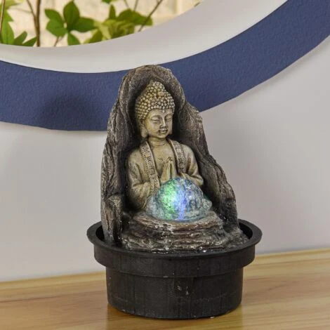 Questa fontana di interno in resina è costituita da una vasca sulla quale poggia un décor rappresentante un Buddha in meditazione con frontale una sfera di vetro che sembra evitarlo grazie a deflusso dell’ acqua. L’ illuminazione si fatto per illuminazione a LED multicolore.
